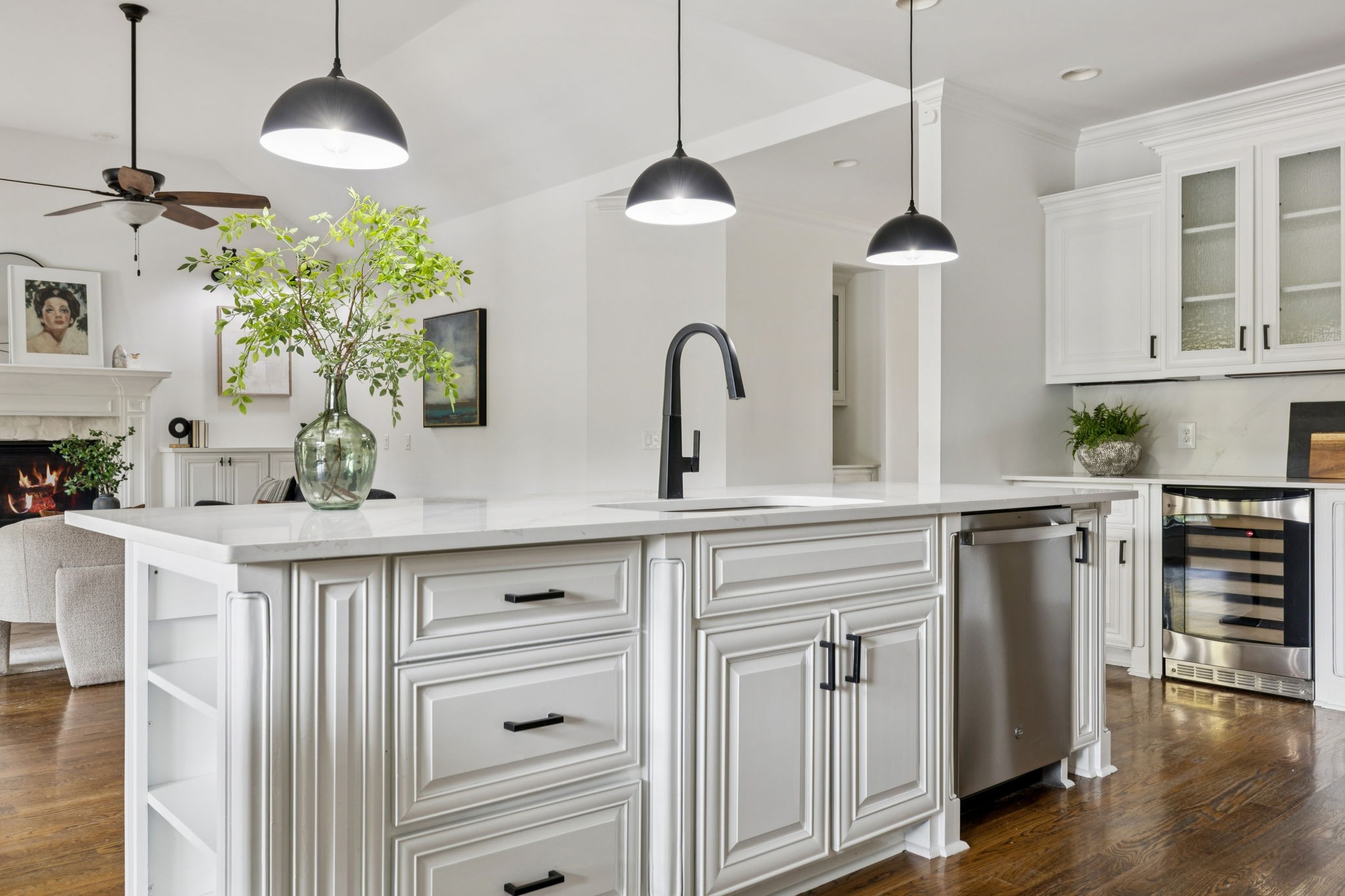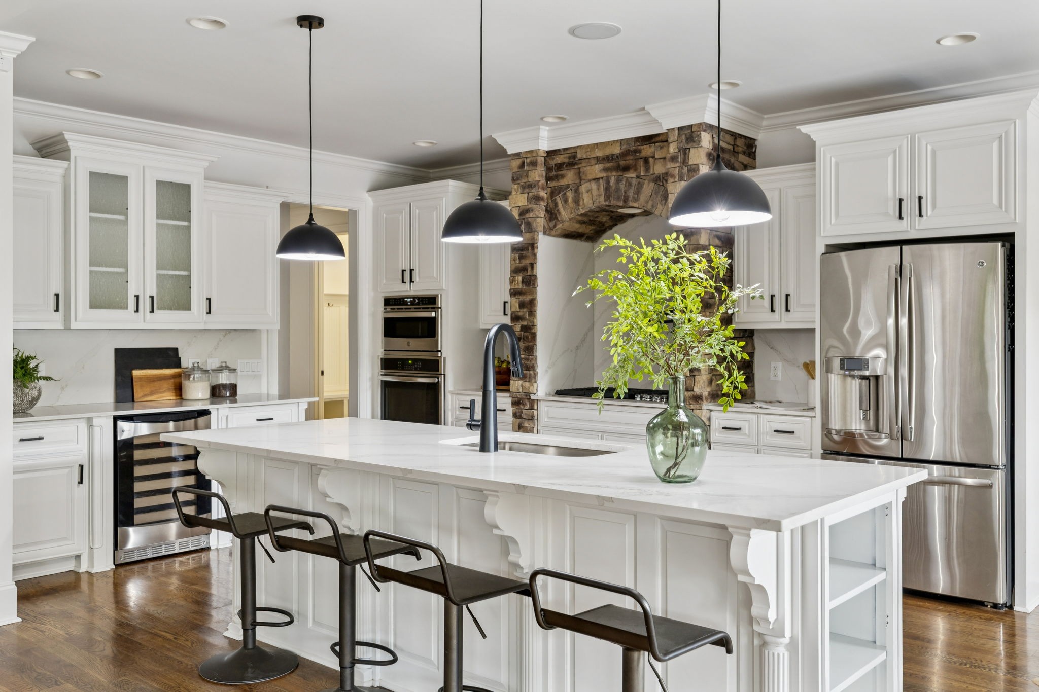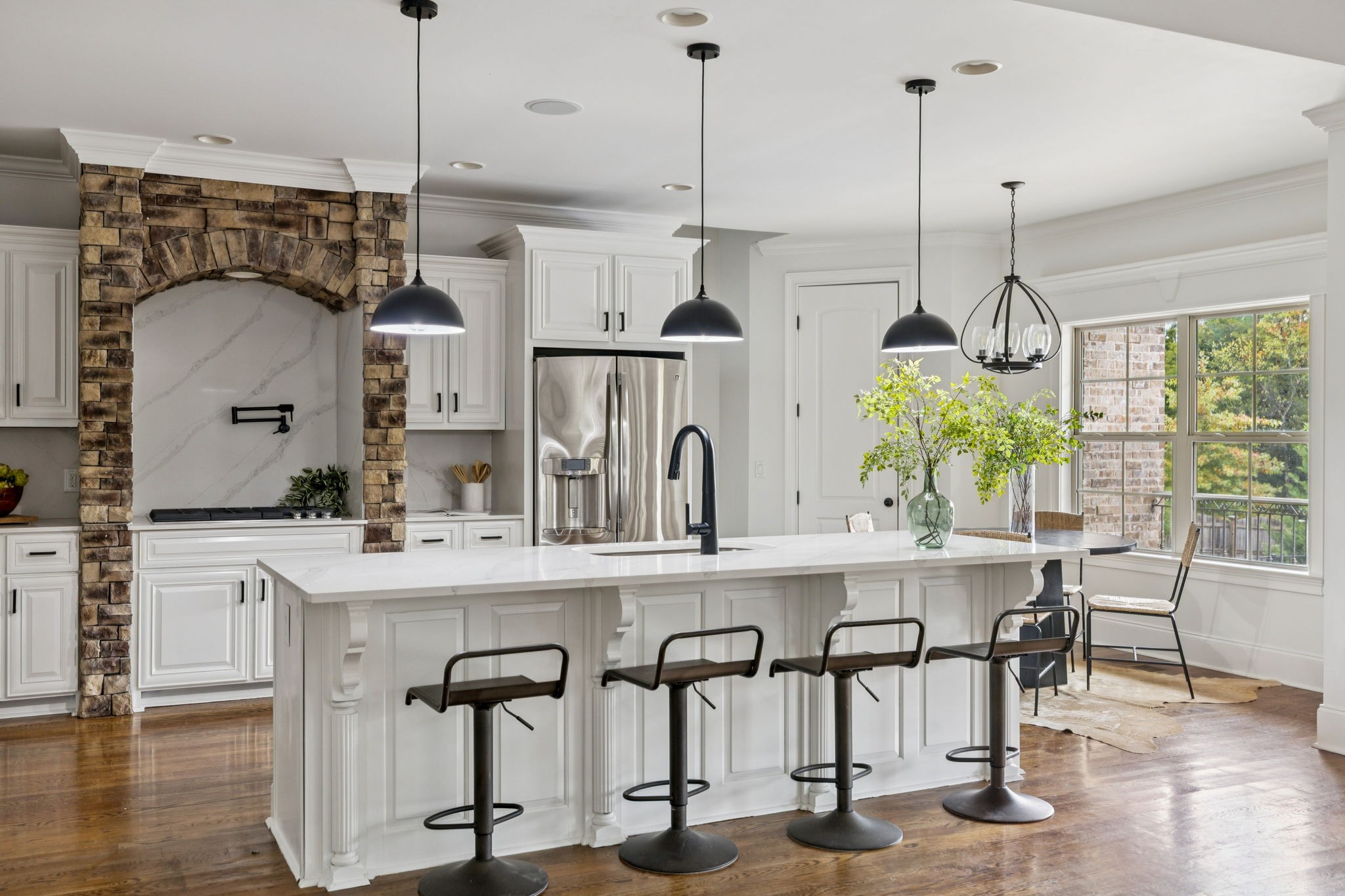 Inside, refined finishes and thoughtful upgrades create a warm, elevated ambiance. Rich hardwood flooring, fresh paint, and designer touches flow throughout. The chef's kitchen is a standout with quartz countertops, stainless steel appliances, a pot filler, and an expansive island that invites gathering. The living room centers around a custom fireplace with built-ins, while the main-level primary suite offers a spa-like escape with a steam shower, jetted tub, and a custom closet with convenient access to the utility room.