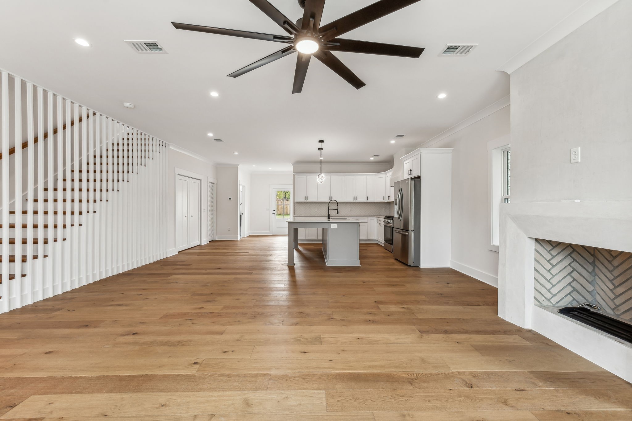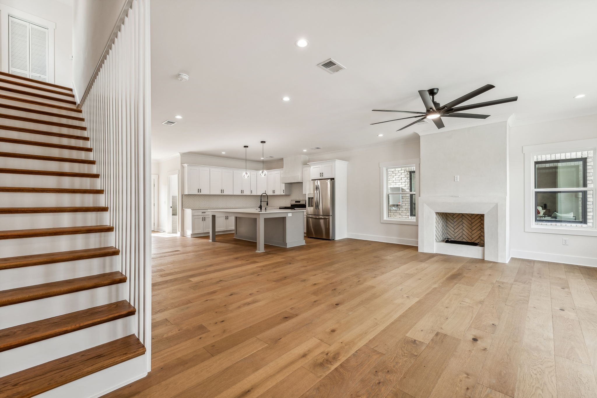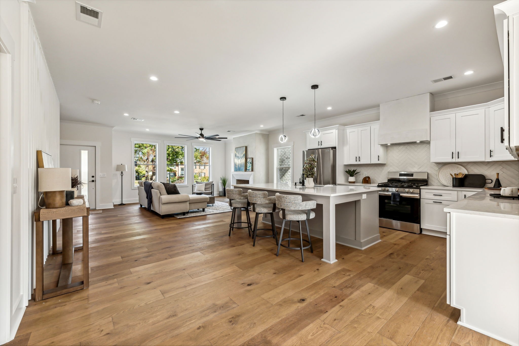 The open main living area showcases hardwood and tile floors throughout (no carpet), a hand-plastered fireplace, a gas range with a true exterior-vented hood, and soft-close custom cabinetry. The kitchen and baths are finished with clean modern lines and quality materials, while a tankless water heater and full spray-foam insulation add efficiency and comfort.