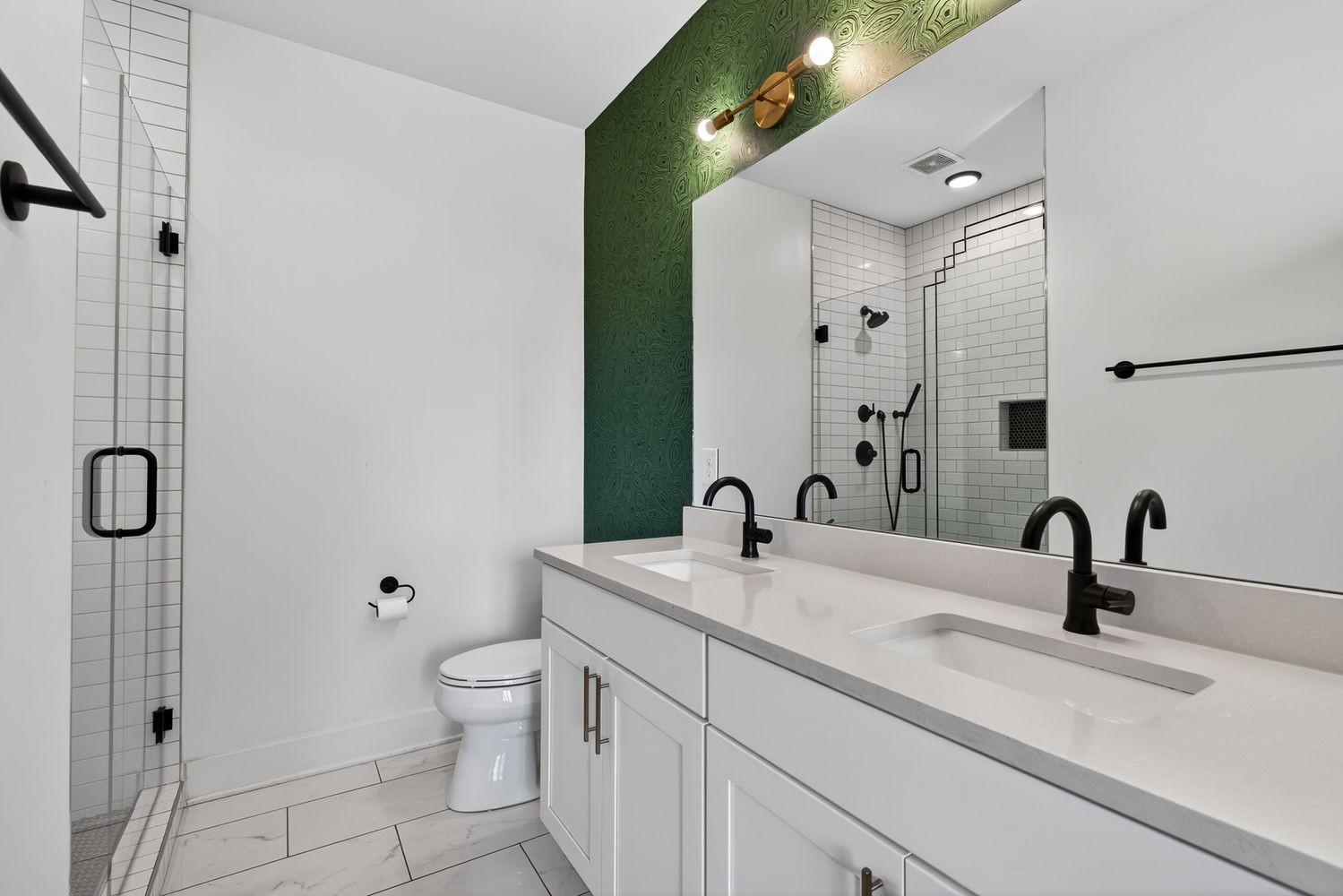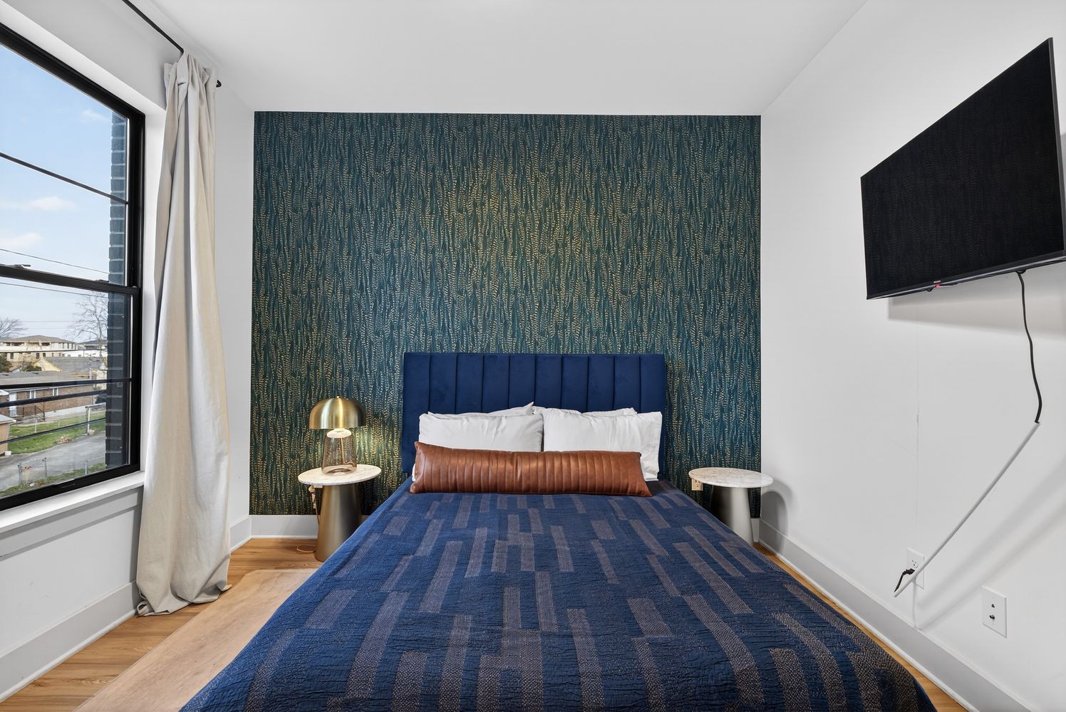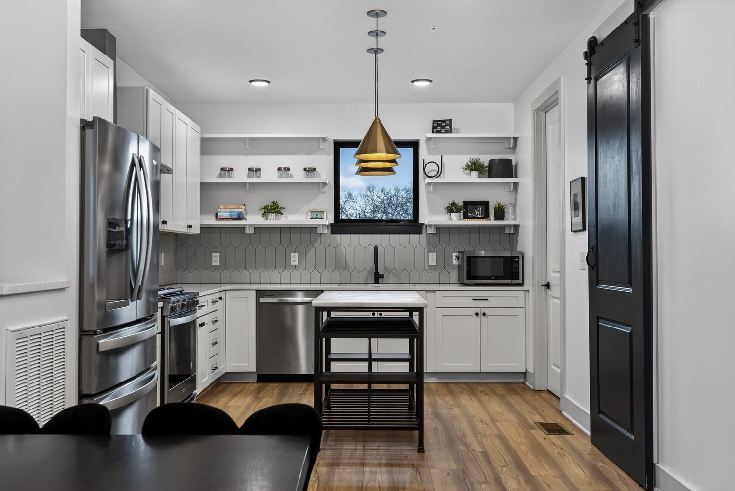 The home opens into a bright, expansive layout designed for both everyday living and entertaining, anchored by a chef's kitchen with quartz countertops, custom wallpaper, and thoughtfully selected designer lighting. LVT flooring runs throughout, tying everything together with a clean, modern feel while offering durability that actually fits real life.