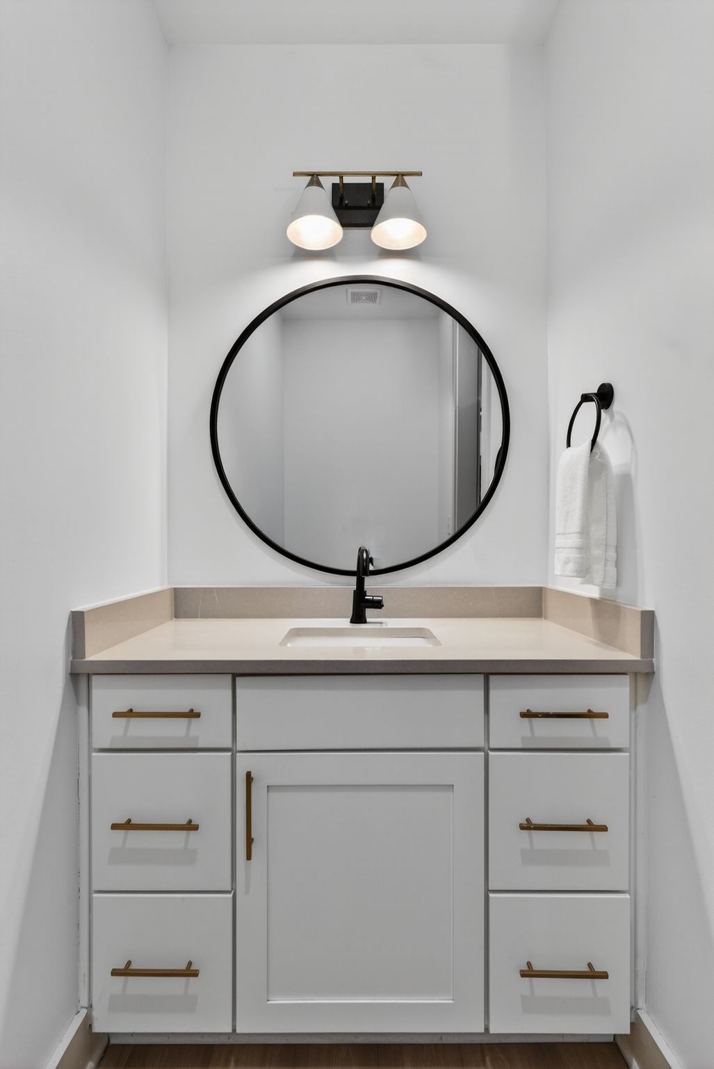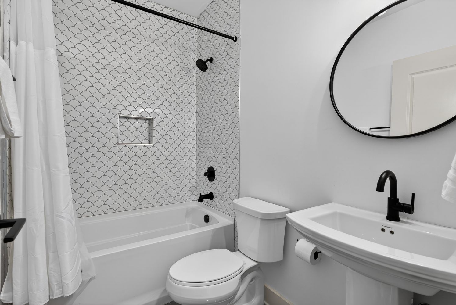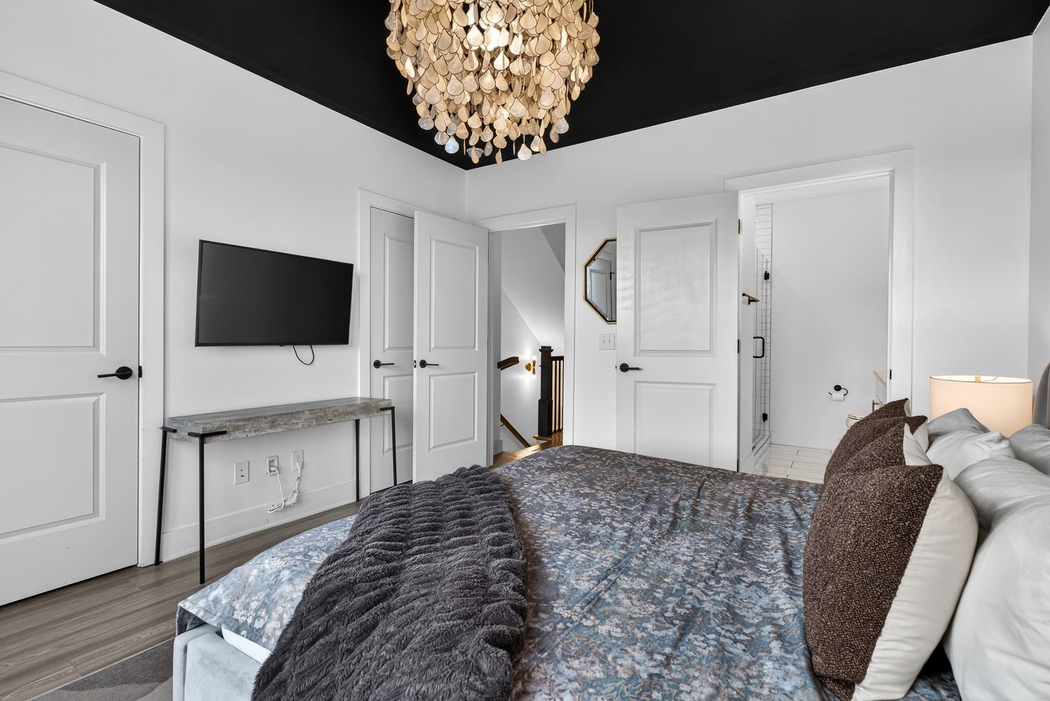 The home opens into a bright, expansive layout designed for both everyday living and entertaining, anchored by a chef's kitchen with quartz countertops, custom wallpaper, and thoughtfully selected designer lighting. LVT flooring runs throughout, tying everything together with a clean, modern feel while offering durability that actually fits real life.