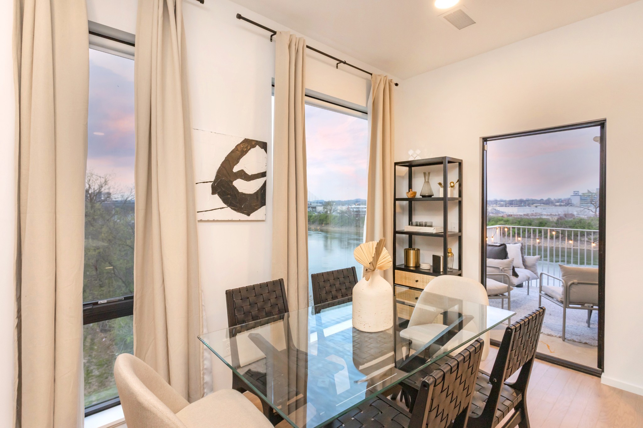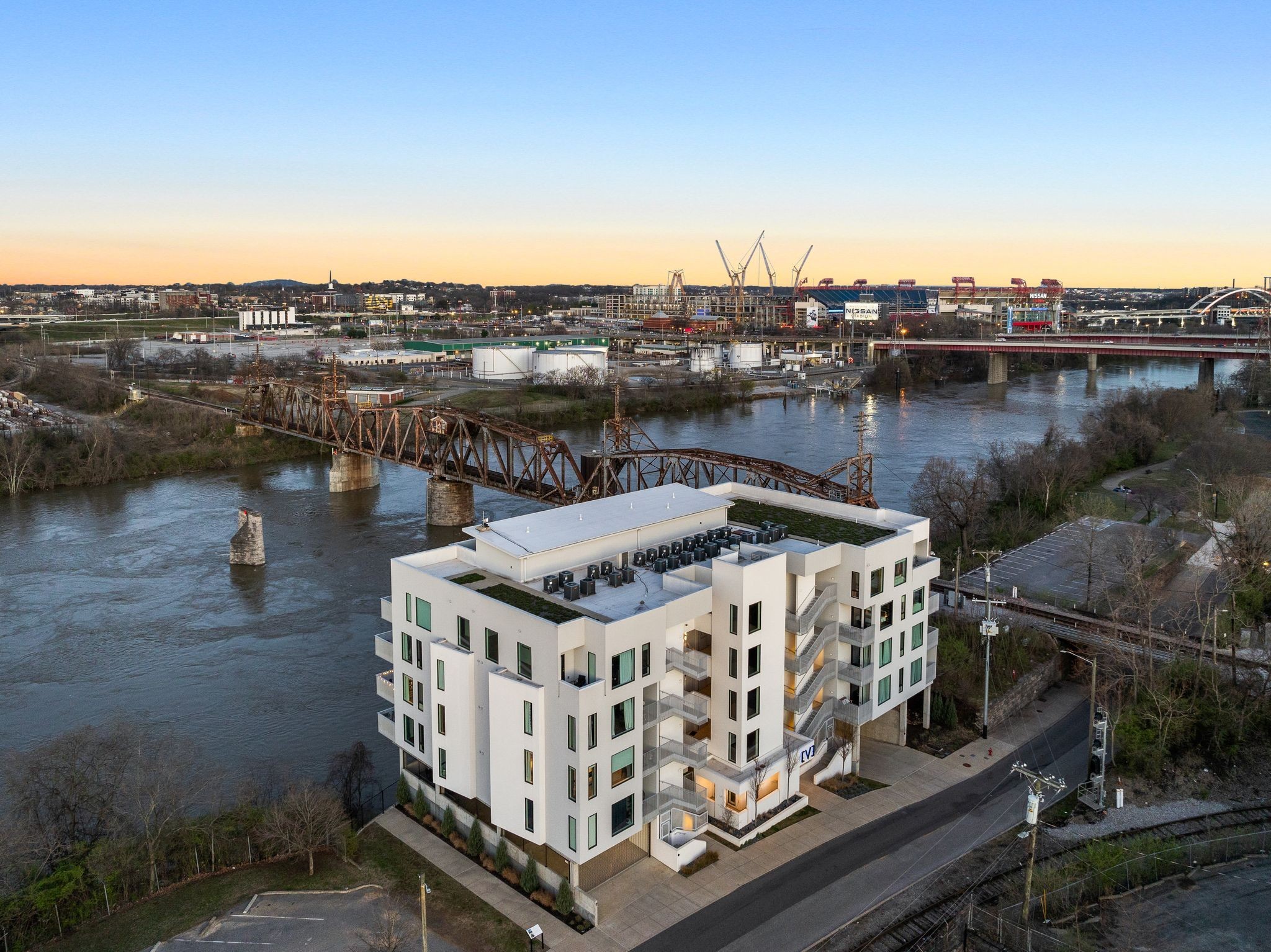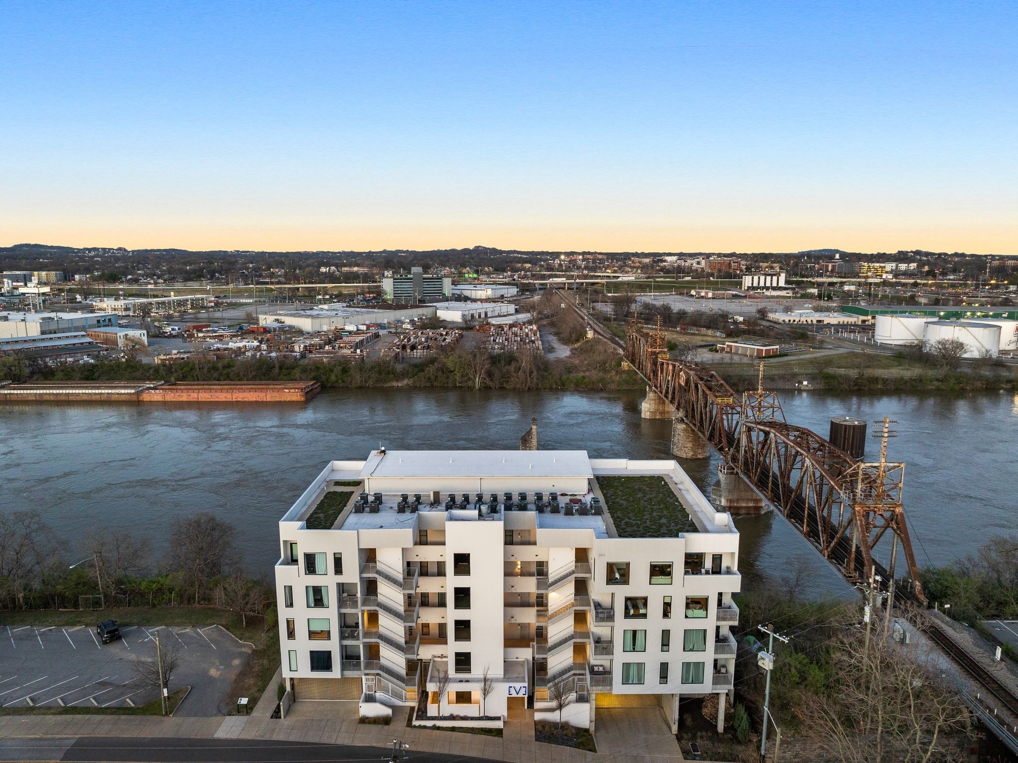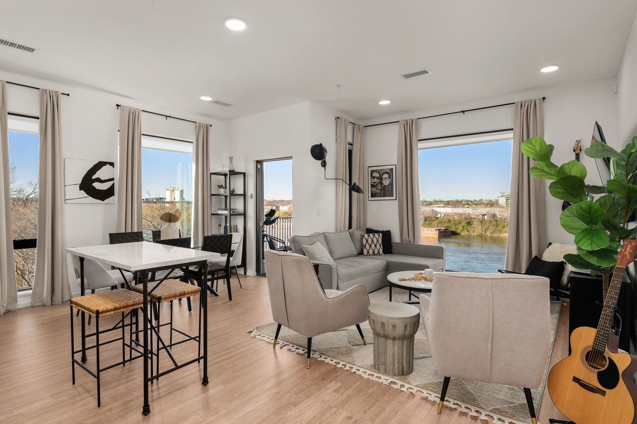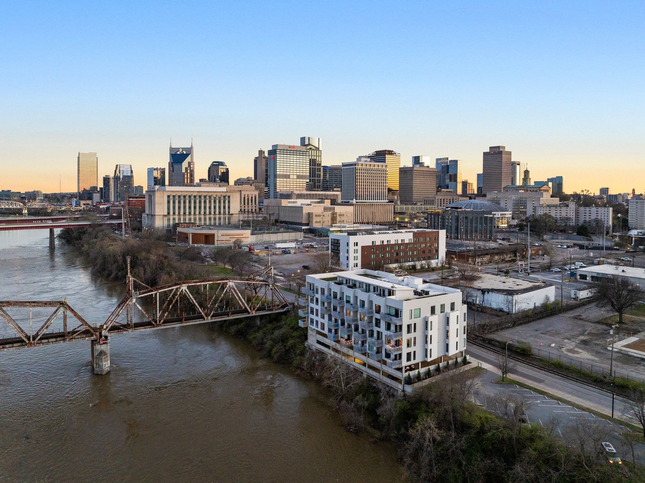 Premier unit at The Eve- one of the most coveted floor plans in the building, offering 3 bedrooms with spacious closets, powder room, and two private balconies with panoramic riverfront and downtown views. One of just 28 exclusive homes in this boutique development, this unit places you directly on the Cumberland River and sits across from the emerging Oracle campus. The interior showcases thoughtful design with extra-tall ceilings that enhance the natural light flowing throughout the space. Custom wallpaper adds character with premium finished wood flooring. The kitchen features a complete package of stainless steel appliances, perfect for both everyday cooking and entertaining. Primary suite opens to the second level private balcony, allowing you to start each day with unobstructed river and skyline views. Strategically located near both Downtown and Germantown, you'll enjoy proximity to acclaimed restaurants, coffee shops, and boutiques. A brief walk connects you to Broadway's entertainment district when you're ready to experience Nashville's vibrant nightlife. The residence offers complete flexibility with short-term rental eligibility--whether you choose to live here full-time, rent long-term, or utilize as a short-term rental investment. Professionally designed by Boots Up Design & Wallpaper Co.
