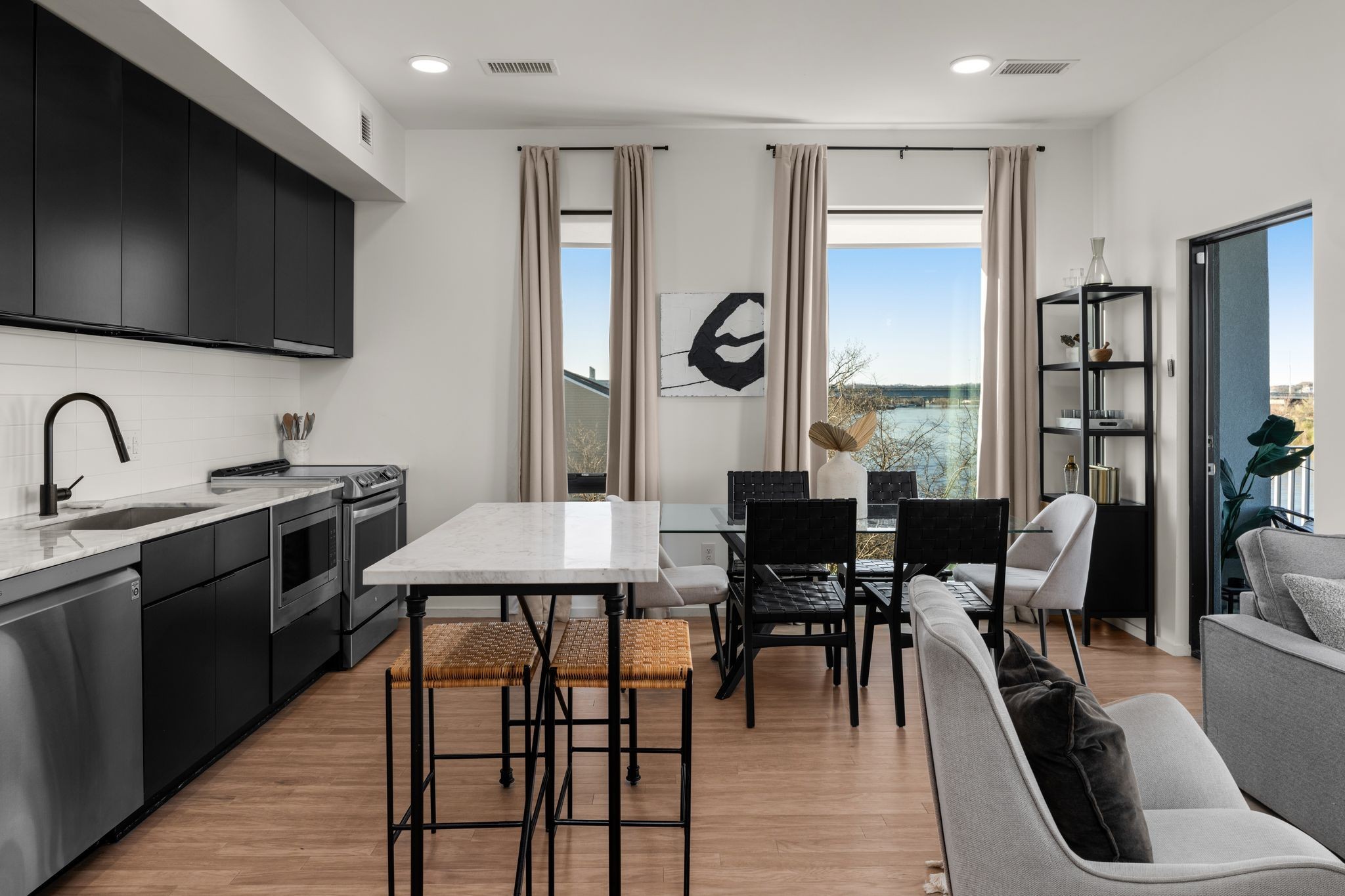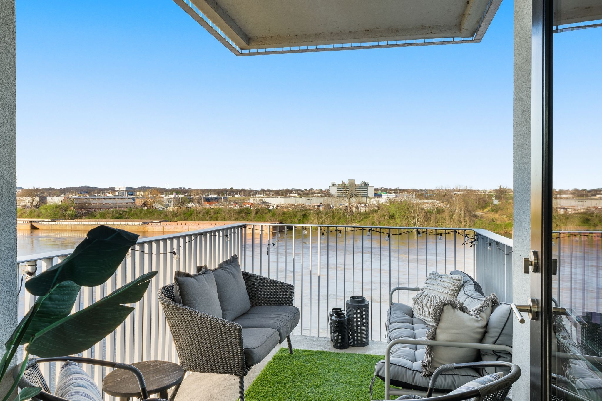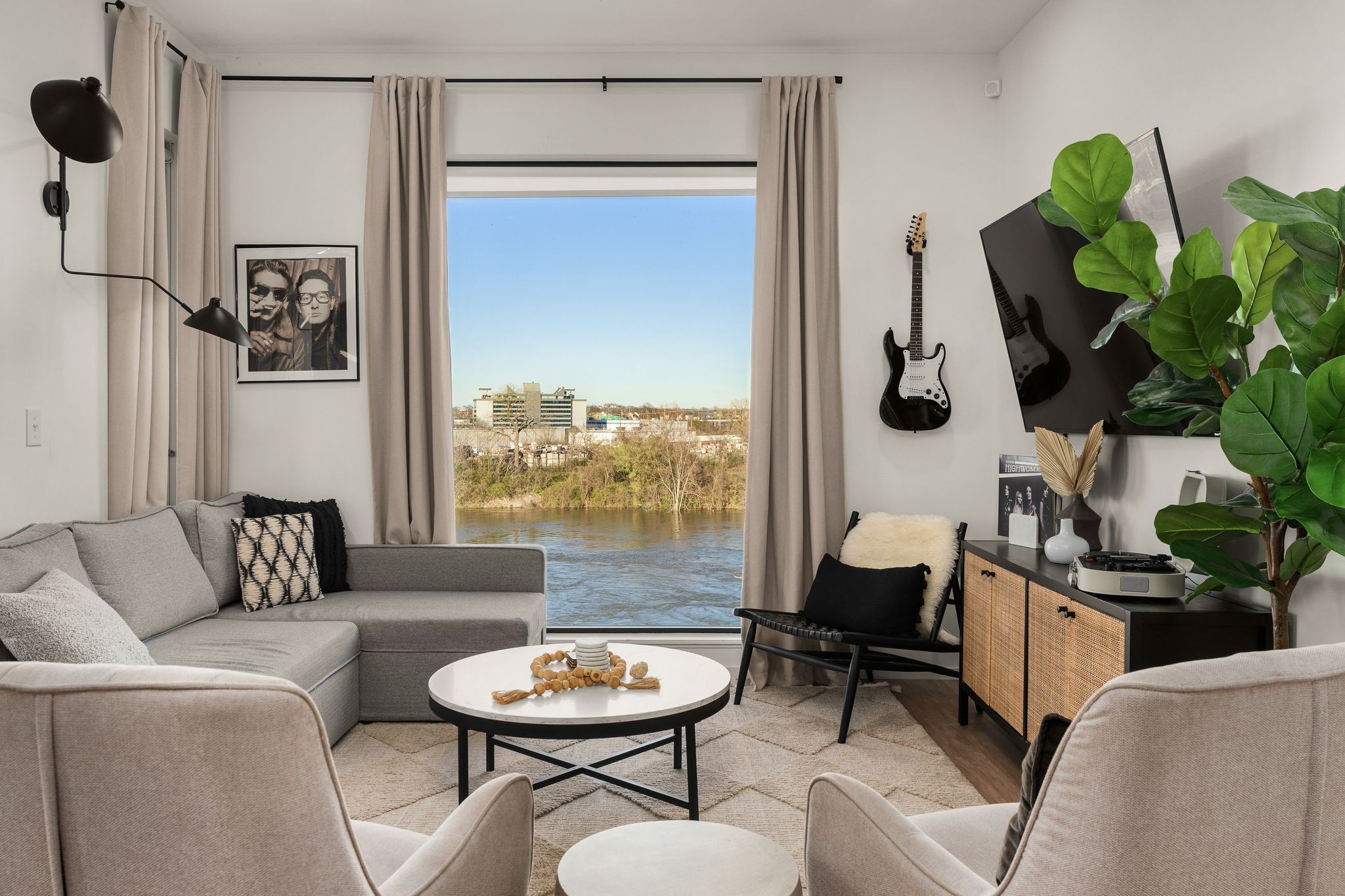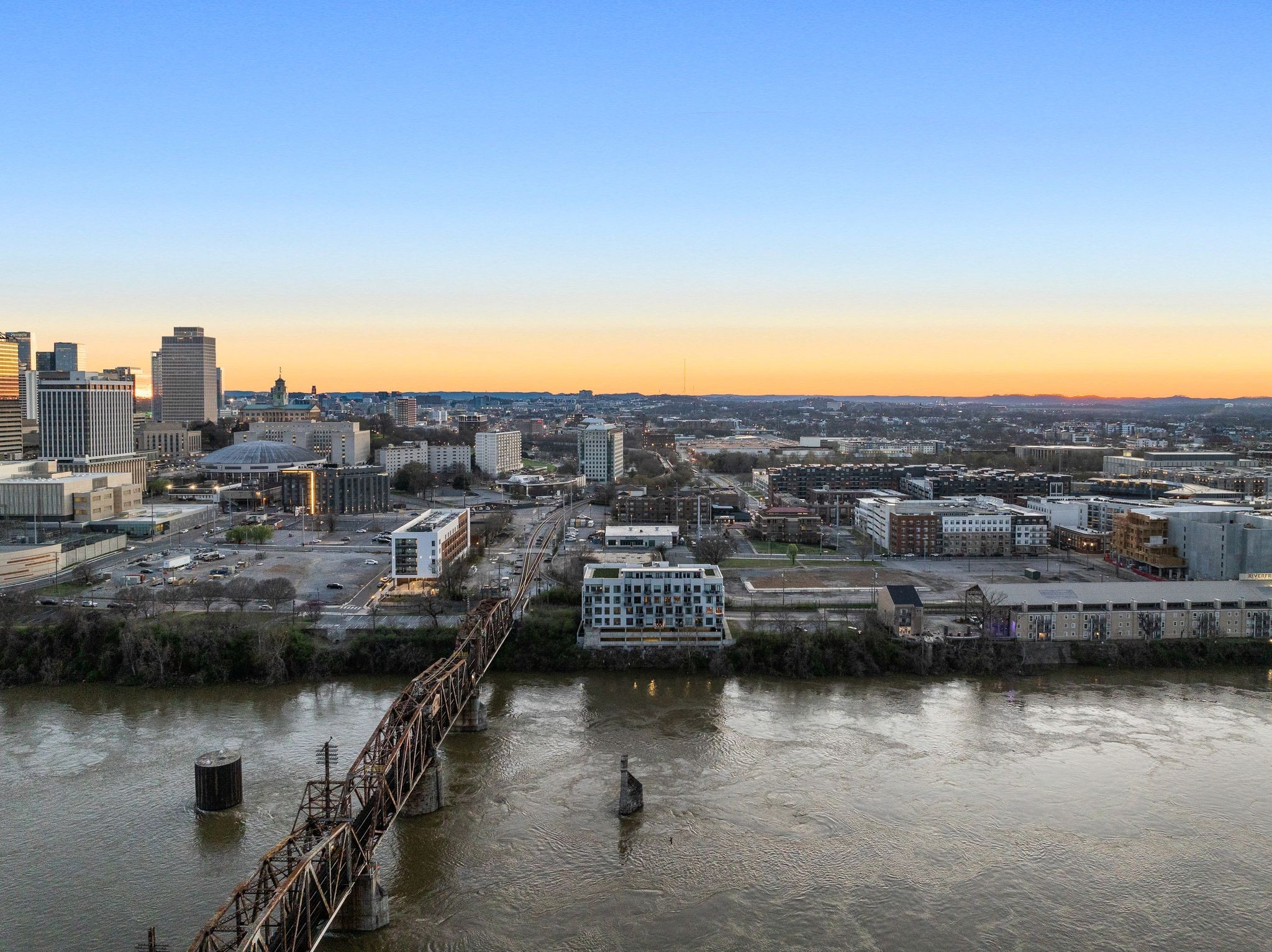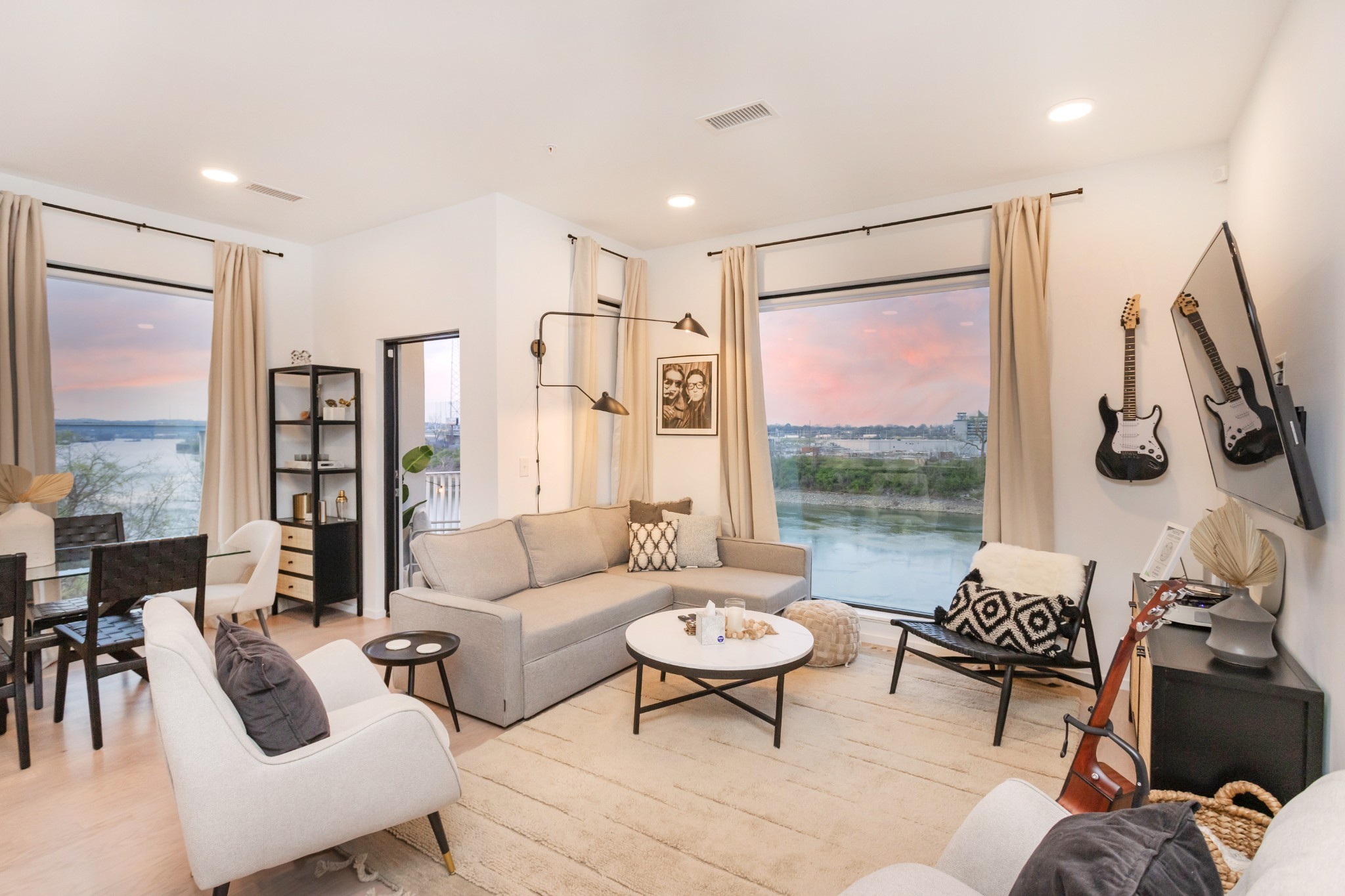 Premier unit at The Eve- one of the most coveted floor plans in the building, offering 3 bedrooms with spacious closets, powder room, and two private balconies with panoramic riverfront and downtown views. One of just 28 exclusive homes in this boutique development, this unit places you directly on the Cumberland River and sits across from the emerging Oracle campus. The interior showcases thoughtful design with extra-tall ceilings that enhance the natural light flowing throughout the space. Custom wallpaper adds character with premium finished wood flooring. The kitchen features a complete package of stainless steel appliances, perfect for both everyday cooking and entertaining. Primary suite opens to the second level private balcony, allowing you to start each day with unobstructed river and skyline views. Strategically located near both Downtown and Germantown, you'll enjoy proximity to acclaimed restaurants, coffee shops, and boutiques. A brief walk connects you to Broadway's entertainment district when you're ready to experience Nashville's vibrant nightlife. The residence offers complete flexibility with short-term rental eligibility--whether you choose to live here full-time, rent long-term, or utilize as a short-term rental investment. Professionally designed by Boots Up Design & Wallpaper Co.