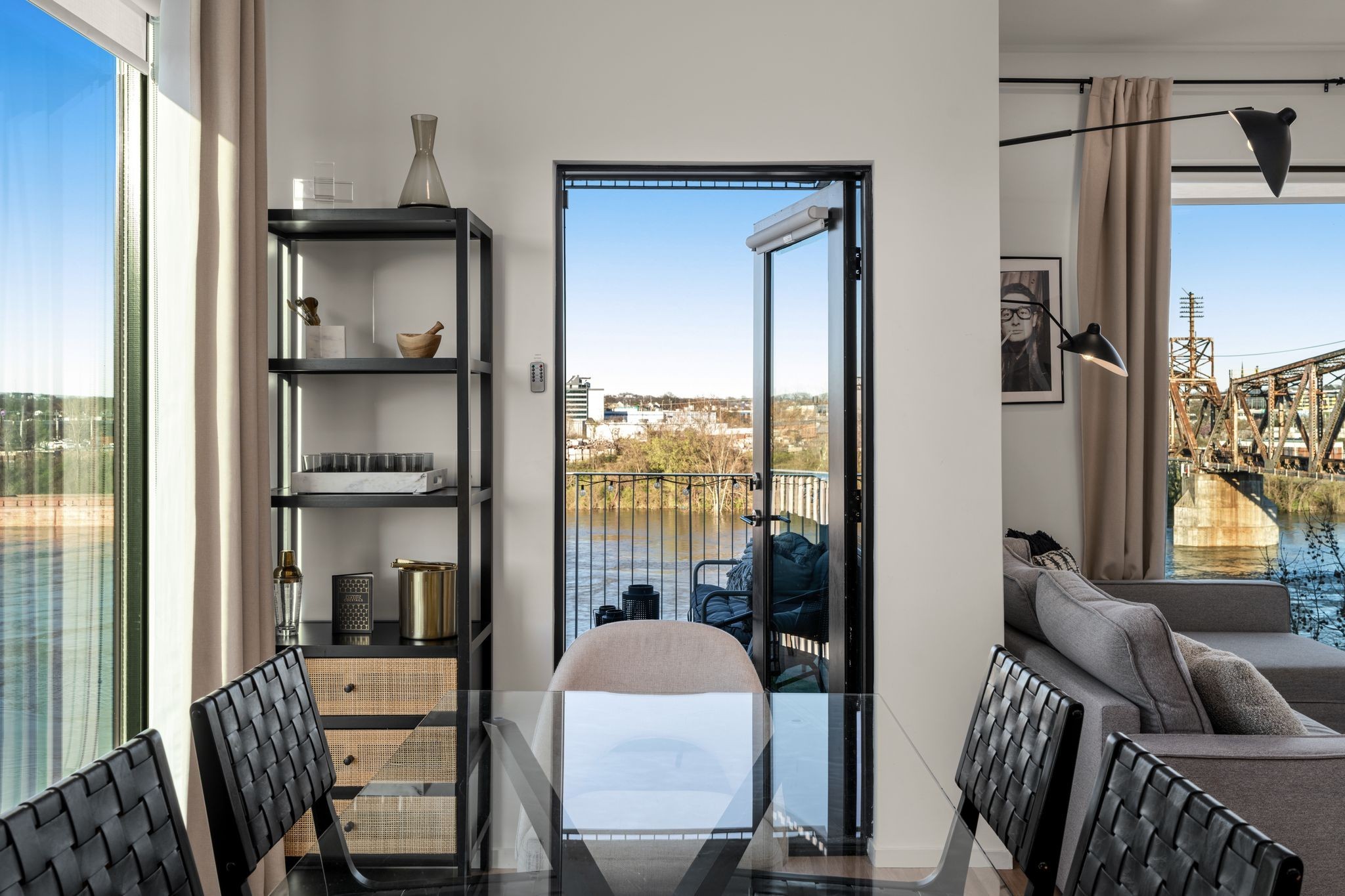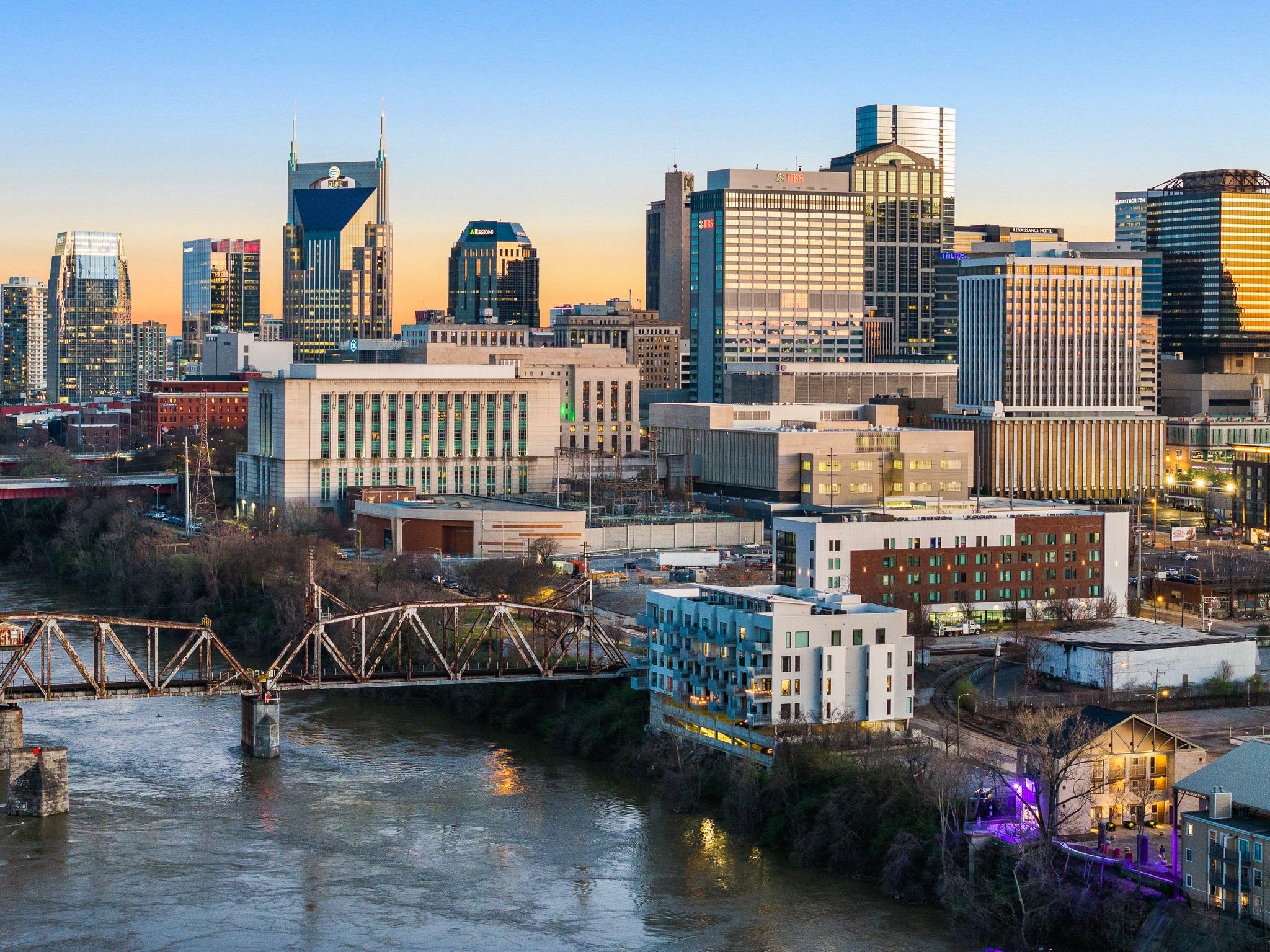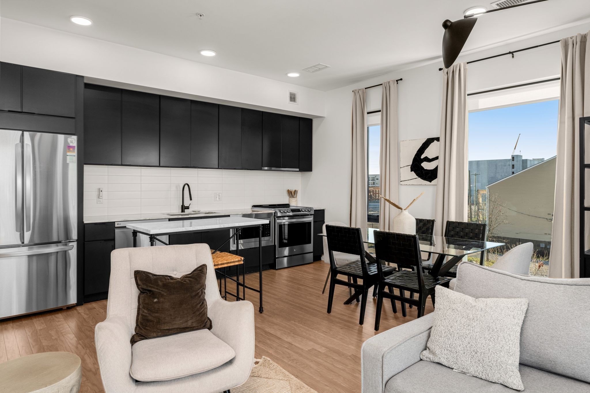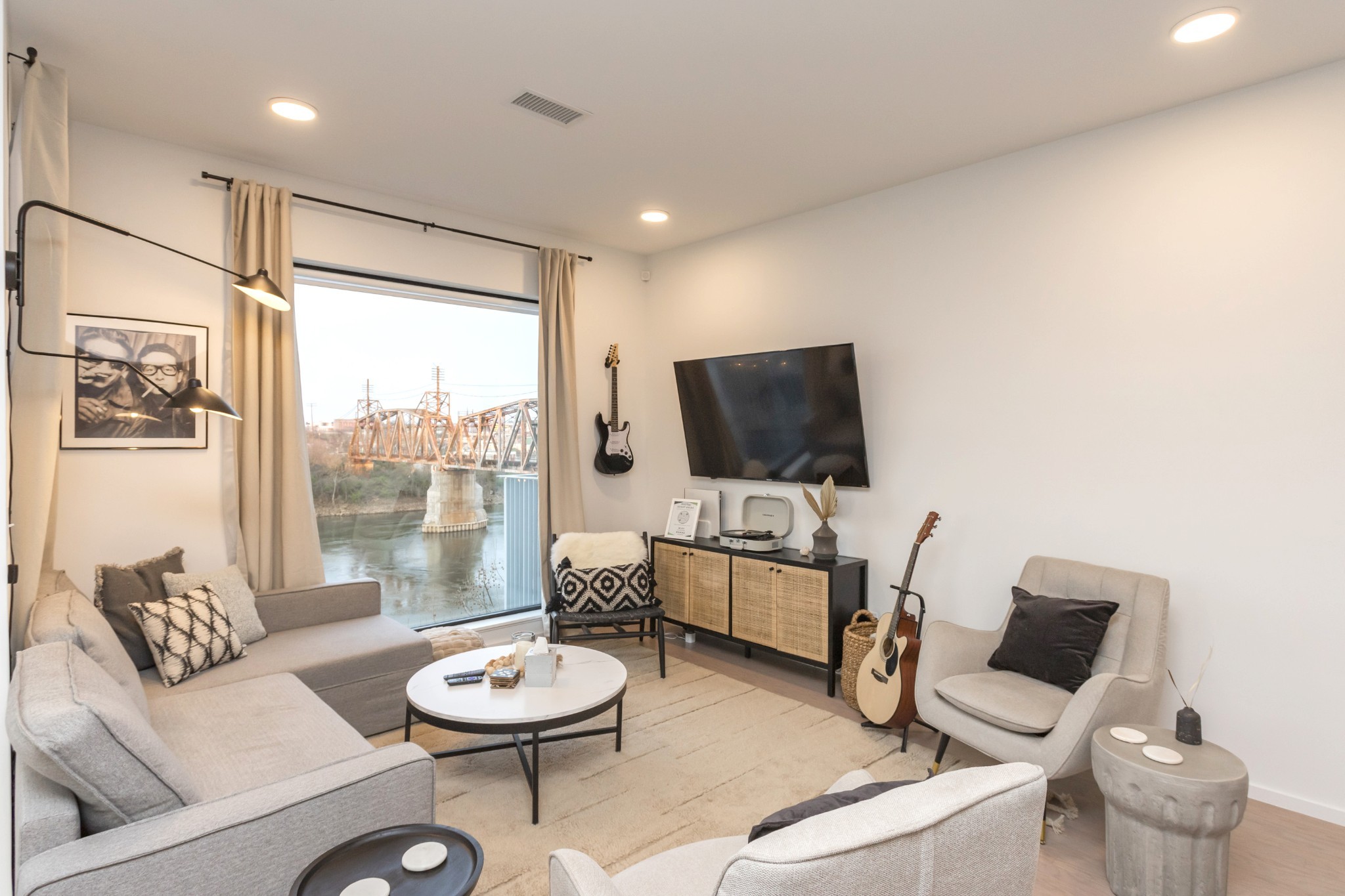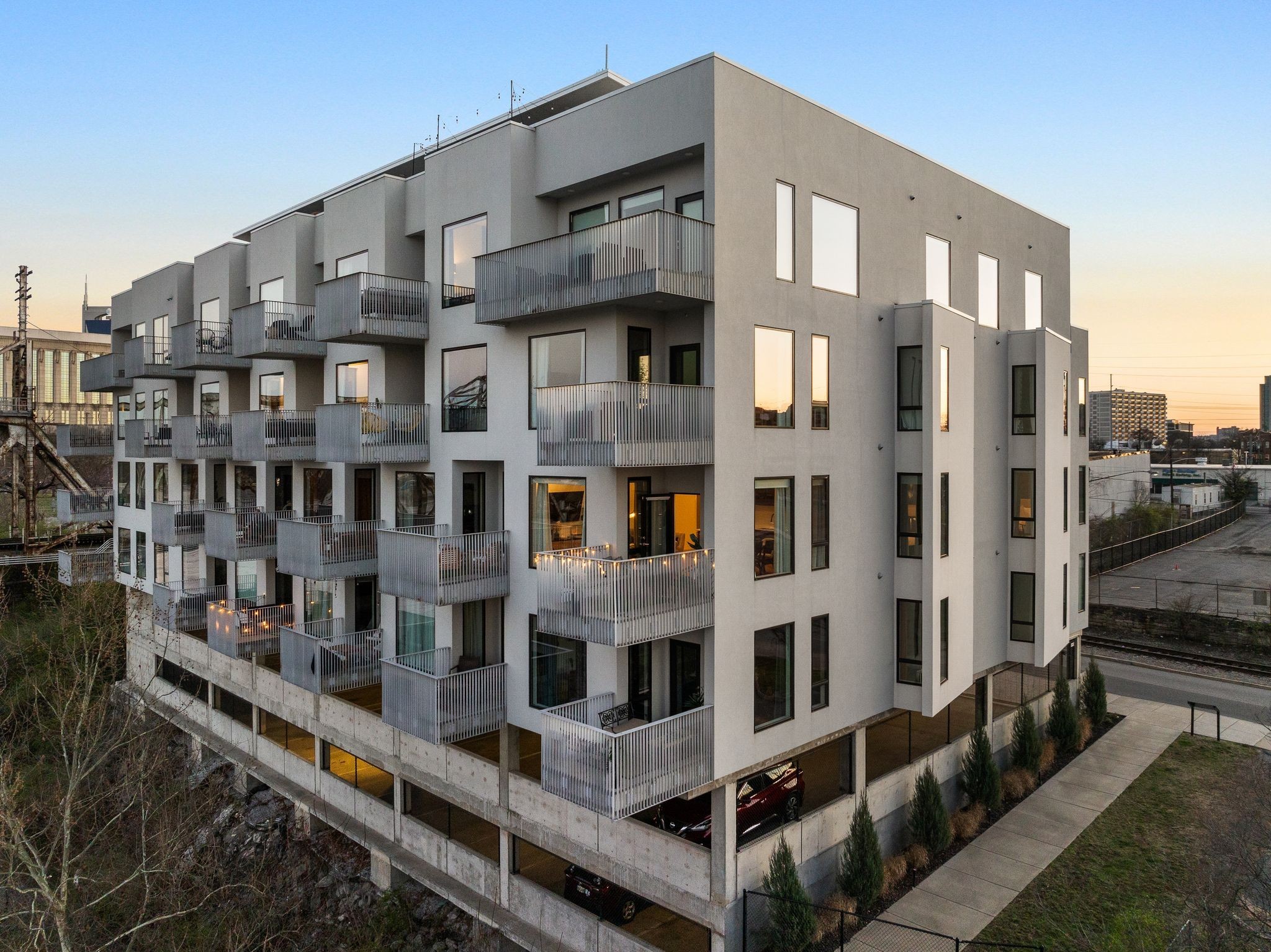Premier unit at The Eve- one of the most coveted floor plans in the building, offering 3 bedrooms with spacious closets, powder room, and two private balconies with panoramic riverfront and downtown views. One of just 28 exclusive homes in this boutique development, this unit places you directly on the Cumberland River and sits across from the emerging Oracle campus. The interior showcases thoughtful design with extra-tall ceilings that enhance the natural light flowing throughout the space. Custom wallpaper adds character with premium finished wood flooring. The kitchen features a complete package of stainless steel appliances, perfect for both everyday cooking and entertaining. Primary suite opens to the second level private balcony, allowing you to start each day with unobstructed river and skyline views. Strategically located near both Downtown and Germantown, you'll enjoy proximity to acclaimed restaurants, coffee shops, and boutiques. A brief walk connects you to Broadway's entertainment district when you're ready to experience Nashville's vibrant nightlife. The residence offers complete flexibility with short-term rental eligibility--whether you choose to live here full-time, rent long-term, or utilize as a short-term rental investment. Professionally designed by Boots Up Design & Wallpaper Co.