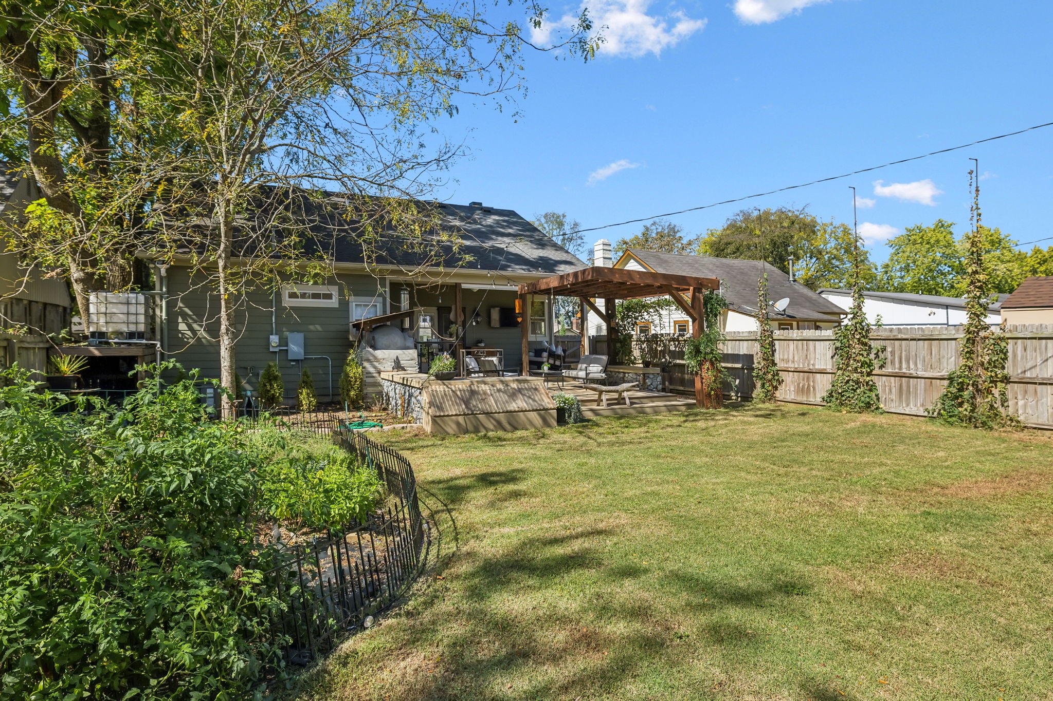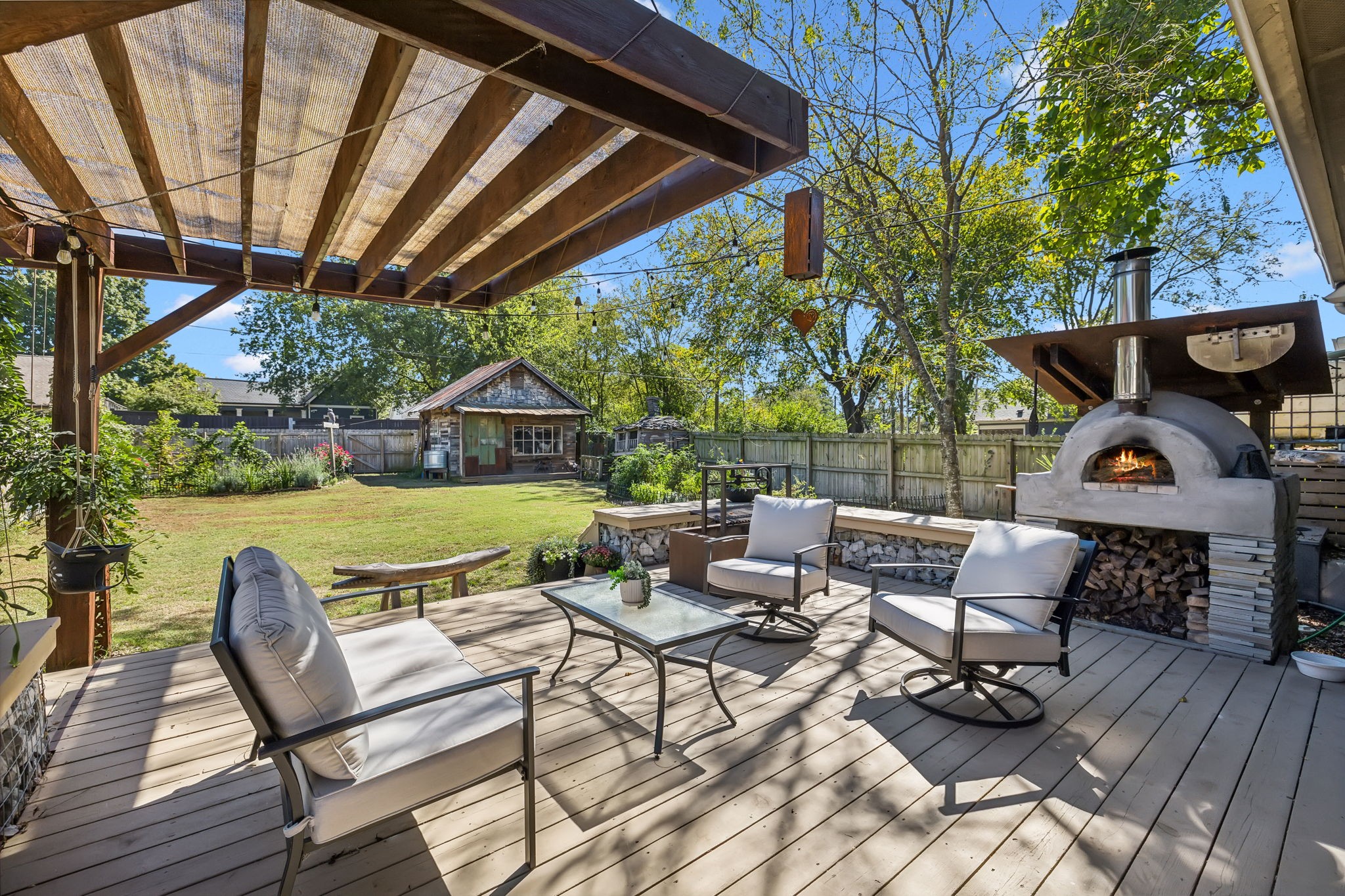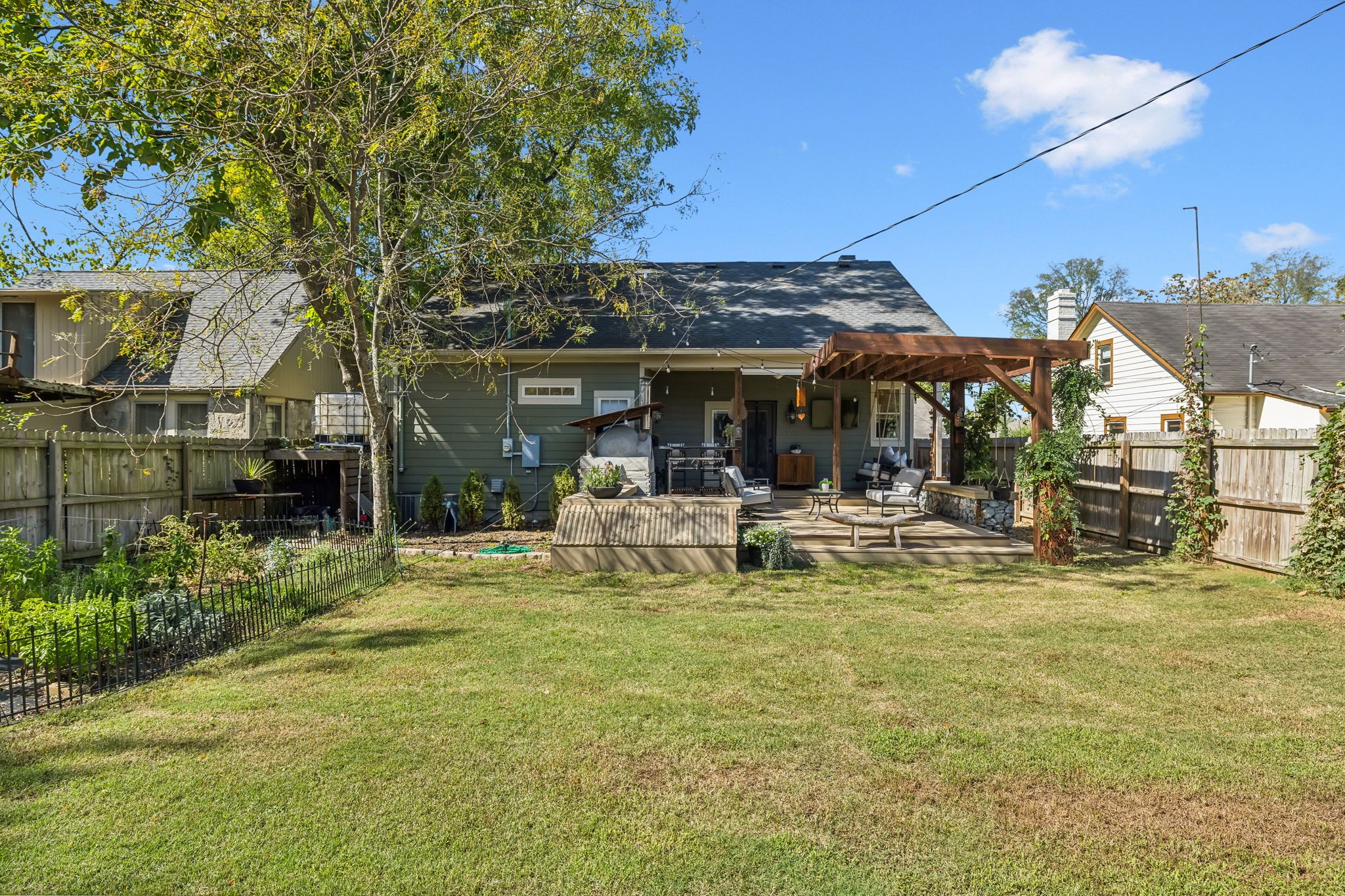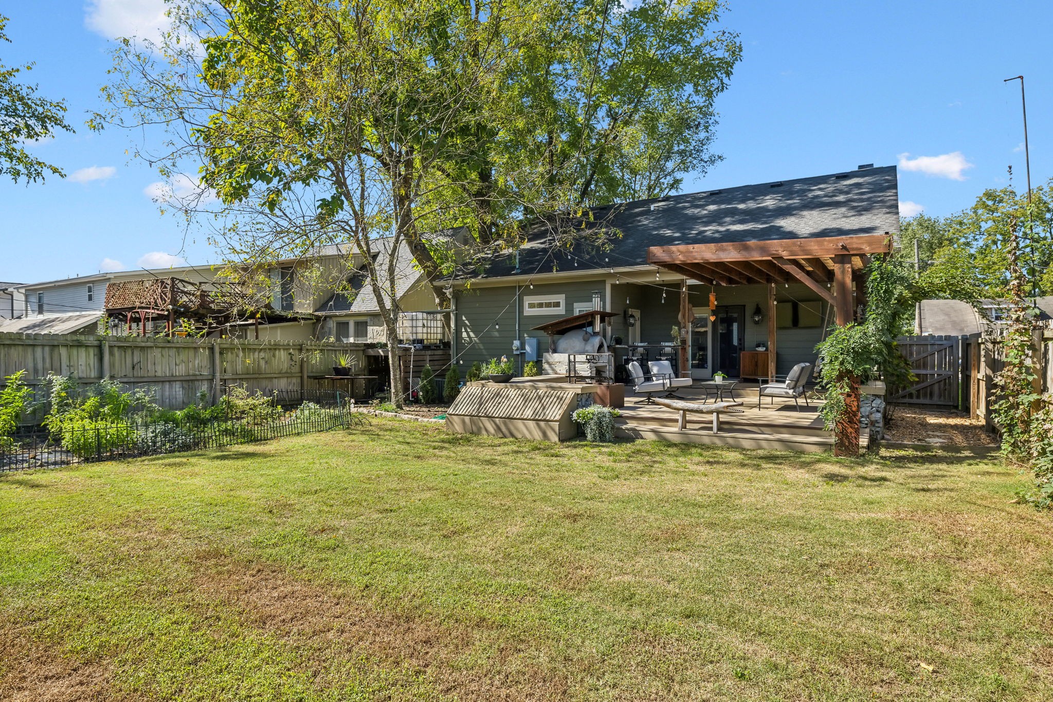 In the heart of East Nashville, this one-level Craftsman-style home offers the perfect blend of modern luxury & sustainable living. Convenience with charm, walk to top dining destinations like The Pharmacy, Mas Tacos & more!. The bright, open interior features wide plank hardwood floors & abundant natural light flows through large windows. The heart of the home, the updated chef's kitchen, boasts high-end appliances, sleek countertops, & custom cabinetry; Perfect for entertaining! The open layout connects the kitchen to the dining & living areas, where a cozy fireplace & custom built-ins create a warm, inviting atmosphere. The primary suite is a true retreat with a backyard picturesque view! The backyard is an outdoor oasis, complete with a covered porch, a pergola-topped deck, & over 700 square feet of garden space. Enjoy the Argentinean grill, wood-fired oven, fire pit, water harvester, a treehouse chicken coop & a climate-controlled storage shed. This is urban living at its finest!
